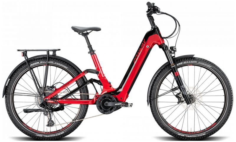 Rahmen: CONWAY Intube Wave Fully Bosch Rahmenmaterial: Aluminium Laufradgröße: 27.5″ Farbe: red metallic / black metallic Gabel: RST „Vibe Air“, 110mm Dämpfer: FOX „Float DPS“ 100 mm Federweg: 110mm / 100mm Bremsen: TEKTRO „HD-M530“, 4/2-Kolben Bremsscheiben: TEKTRO „TR203-17 2,3″“, 203 mm / 180 mm Bremshebel: TEKTRO „HD-M530“ Steuersatz: ZS44 / ZS56, Blocklock Vorbau: LEVELNINE „Adjustable“ Lenker: LEVELNINE „Low Riser“, Ø 31,8, 720 mm Griffe: SQLAB „70X“ Sattel: SELLE ROYAL „Vivo Athletic Ergo“ Sattelstütze: CONWAY „Droper Post“, 31,6 mm Kurbel: FSA „CK-745“, 165 mm, SRAM „Gen4 Eagle DM non-B“, 38 Z., w CG Tretlager/Innenlager: BOSCH Schaltwerk: SRAM „SX Eagle“, 12speed Schalthebel: SRAM „SX Eagle Trigger“, single click Kassette: SRAM „PG 1210 Eagle“, 11-50 Z. Kette: SRAM „SX Eagle“ Reifen: SCHWALBE „Johnny Watts“, 60-584, Reflex Nabe Vorderrad: FORMULA „DC 711“, 15 x 110 mm Nabe Hinterrad: FORMULA „DCL 360“, 12×142 mm Speichen: Niro Felgen: RODI „Ready 30“ Display: Bosch Kiox Akku: BOSCH „Powertube 625“, 625 Wh Ladegerät: Bosch 4 Ah Motor: BOSCH „Performance CX“ Gen.4, 36 V, 250 W Scheinwerfer: CONTEC „DLUX 80 E+“ Rücklicht: CONTEC „CTL 335 E“, Stoplight Gepäckträger: ATRAN „Cummute Pro“, inkl. Federklappe Pedale: VP „VPE-506“ Sonstiges: Schutzblech, Ständer Zulässiges Gesamtgewicht: 130 kg (Körpergewicht + Fahrrad + Ausrüstung) Gewicht Komplettrad: 28,2 kg