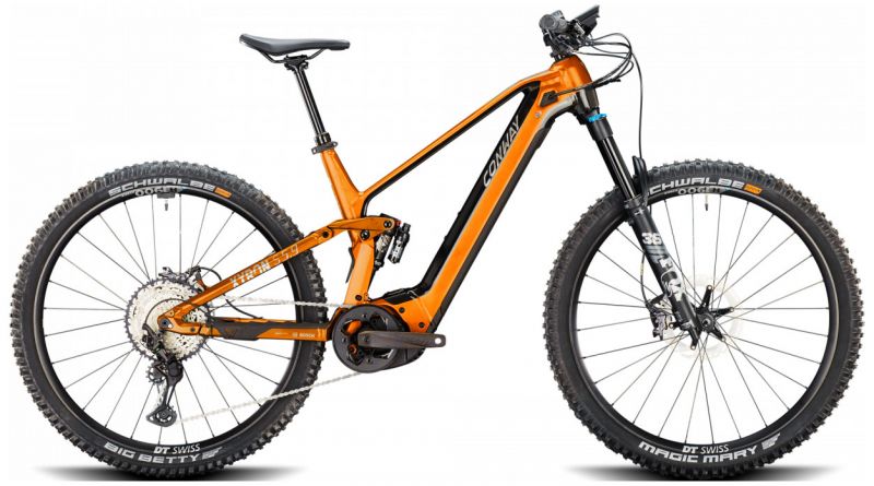 Rahmen: CONWAY Fully Intube Bosch, Alu Rahmenmaterial: Aluminium Laufradgröße: 29″ Farbe: orange / black metallic Gabel: FOX „Performance 36 Float“, 150 mm Dämpfer: FOX „Float X“ 140 mm Federweg: 150 mm / 140 mm Bremsen: SHIMANO „Deore XT BR-M8120″, 4-Kolben Bremsscheiben: SHIMANO „RT-MT800“, 203 mm Bremshebel: SHIMANO „Deore XT BL-M8100“ Vorbau: ERGOTEC „Bass 45“, 31,8 mm Lenker: ERGOTEC „Low Rizer“, Ø 31,8, 780 mm Griffe: SQLAB „70X“ Sattel: FIZIK „Aidon“ Sattelstütze: CONTEC „Drop – A – Gogo“, 31,6 mmCONTEC „Drop – A – Gogo“, 31,6 mm Kurbel: MIRANDA „Epsilon“, 165 mm; MIRANDA B 36 Z Tretlager/Innenlager: BOSCH Schaltwerk: SHIMANO „Deore XT RD-M8100 Shadow Plus“, 12speed Schalthebel: SHIMANO „Deore XT SL-M8100“ Kassette: SHIMANO „CS-M7100“, 10-51 Z. Kette: SHIMANO „CN-M7100“ Reifen vorne: SCHWALBE „Magic Mary“, Soft, 62-622 Reifen hinten: SCHWALBE „Big Betty“, Soft, 62-622 Speichen: DT Swiss Felgen: DT SWISS „Spline H1900″ Display: BOSCH, „Kiox 300“, 4-Stufen, Remote Control, Schiebehilfe Akku: BOSCH „Powertube 750“, Lithium-Ionen mit BMS, 750 Wh Ladegerät: Bosch 4 Ah Motor: BOSCH Mittelmotor Gen.4 „Performance CX“, 36 V, 250 W Pedale: nicht im Lieferumfang enthalten Zulässiges Gesamtgewicht: 130 kg (Körpergewicht + Fahrrad + Ausrüstung) Gewicht Komplettrad: 26,9 kg