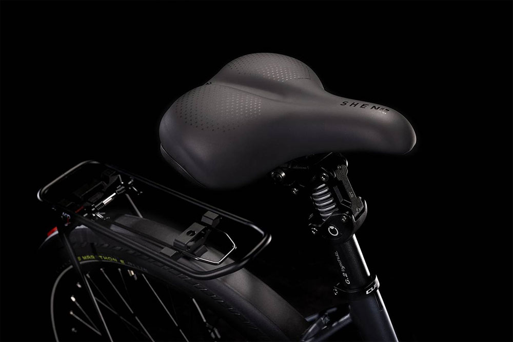 Im Rückwärts spielen die hydraulischen Shimano Scheibenbremsen und griffigen Schwalbe Marathon E-Plus Reifen ihre Qualitäten aus und bringen das Bike zuverlässig zum Stehen, egal bei welchem Wetter. Und weil wir eine Suntour Federgabel, eine gefederte Byschulz Sattelstütze und einen verstellbaren Speedlifter Lenker verbaut haben, ist man immer überaus komfortabel unterwegs. Support und Sicherheit auf dem Arbeitsweg, beim Shoppen oder in der Freizeit liefern die Schutzbleche, ein semi-integrierter Gepäckträger, Lichter und ein Seitenständer. City-E-Biken geht jetzt so einfach – und stylish – wie noch nie!